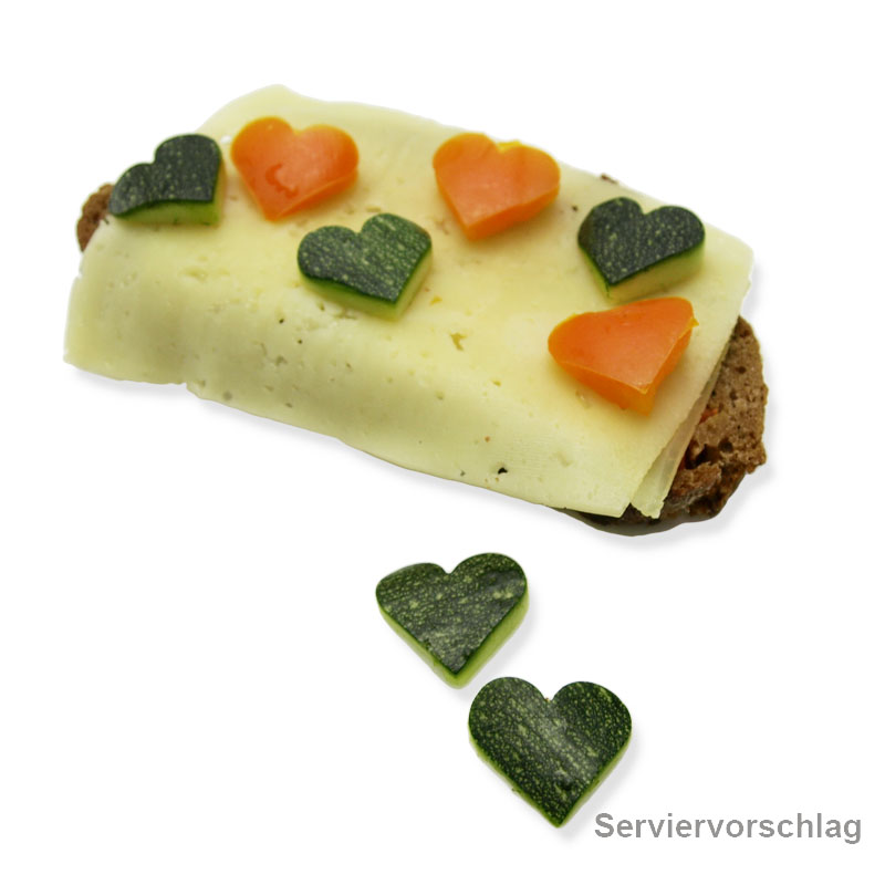 Dekorieren Sie beispielsweise mit Paprika- und Gurkenherzen Käsebrote, verwenden Sie Karottenherzen als Einlage in klaren Gemüsesuppen oder verleihen Sie Spaghetttisaucen eine extra Portion Gemüse mit kleinen Zucchiniherzen.