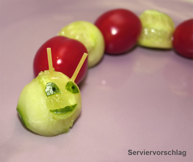 Gurkenraupe: Von einer dicke Gurke ein ca. 15 cm langes Stück abschneiden. Davon der Länge nach ein Drittel abschneiden und 4-6 Bällchen ausstechen. Abwechselnd ein Gurkenbällchen und eine Cocktailtomate mit einem Stückchen ungekochte Spaghetti aneinander spießen. Etwas Gurkenschale in Form schneiden und als Augen und Mund an einer Seite der Gurkenraupe anbringen. Zum Schluss noch 2 kurze Stücke einer ungekochten Spaghetti als Fühler in den Raupenkopf stecken.
