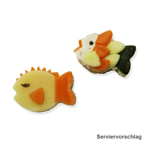 Fisch in der Suppe: Kartoffeln, Knollensellerie und/oder große (!) Karotten in ca 3-5 mm dicke Scheiben schneiden und mit dem Kugelfischausstecher ausstechen. In der Suppe weich kochen. Die Suppe mit den Kugelfischen am besten in blauen Suppentellern servieren.