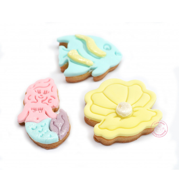 - Maße: 5,9 x 3,7 cm (Meerjungfrau), 5 x 5,2 cm (Muschel), 4,4 x 5 cm (Fisch)
