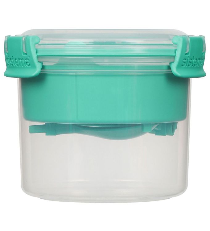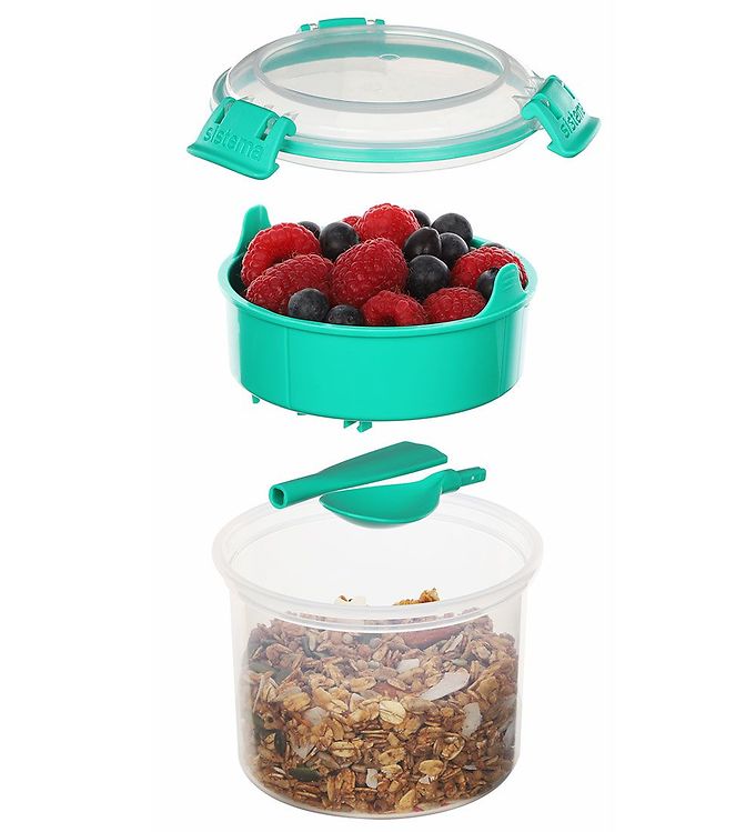 Durch die 2 Teile können Joghurt und Müsli oder auch andere Komponenten getrennt von einander transportiert werden, der Klipverschluss halt länger frisch. Die Box kommt mit einem integrierten Löffel.