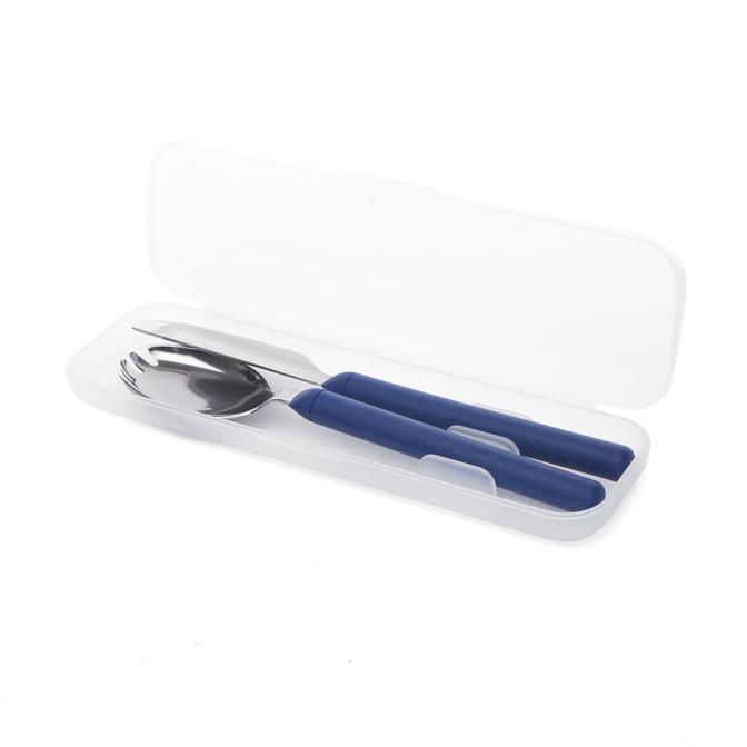 Das Besteckset besteht aus einem Göffel und einem Messer, die durch eine durchsichtige Transportbox geschützt sind. So wird das Besteck auf dem Weg nicht schmutzig. Hat man erst einmal gegessen, sorgt die Hülle dafür, dass das Besteck ohne die Tasche zu verschmutzen, mit nach Hause genommen werden kann.