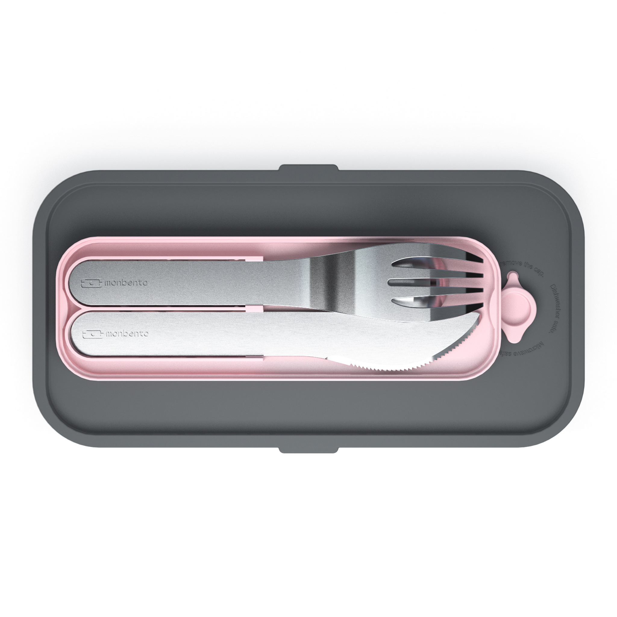 Das spülmaschinenfeste Edelstahlbesteck, bestehend aus Messer, Gabel und Löffel, lässt sich einfach zwischen Zwischendeckel und Zierdeckel der Monbento Boxen verstauen. So ist es immer griffbereit, da wo es gebraucht wird.