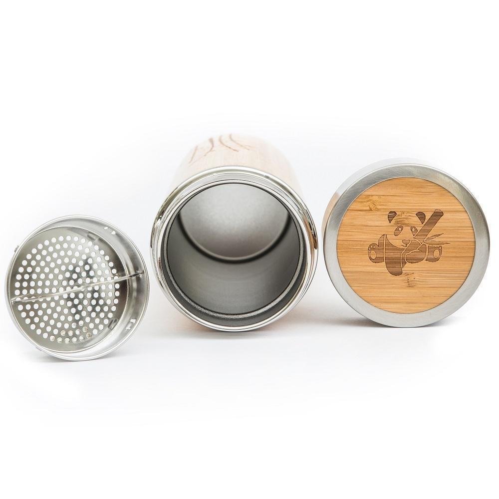 Der Pandoo Thermosbecher wird mit einem zuverlässigen Teesieb geliertert: den losen Tee oder ganze Teeblätter in Sieb legen mit Wasser übergießen, das Sieb nach der Ziehzeit entfernen und den heißen Tee direkt genießen.