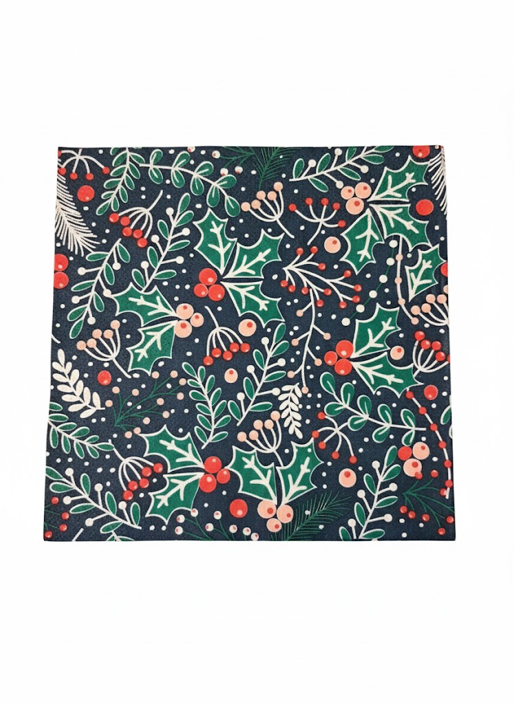 Mit diesen wunderschönen Weihnachtsservietten aus Papier wird jede Jause zu einem kleinen Fest! Das verspielte Motiv mit grünen Stechpalmenblättern, roten Beeren und winterlichen Zweigen auf dunkelblauem Hintergrund sorgt sofort für festliche Stimmung – perfekt für Kinderjausen, Adventsfeiern, Weihnachtsgeburtstage oder das gemeinsame Kekse-Naschen.